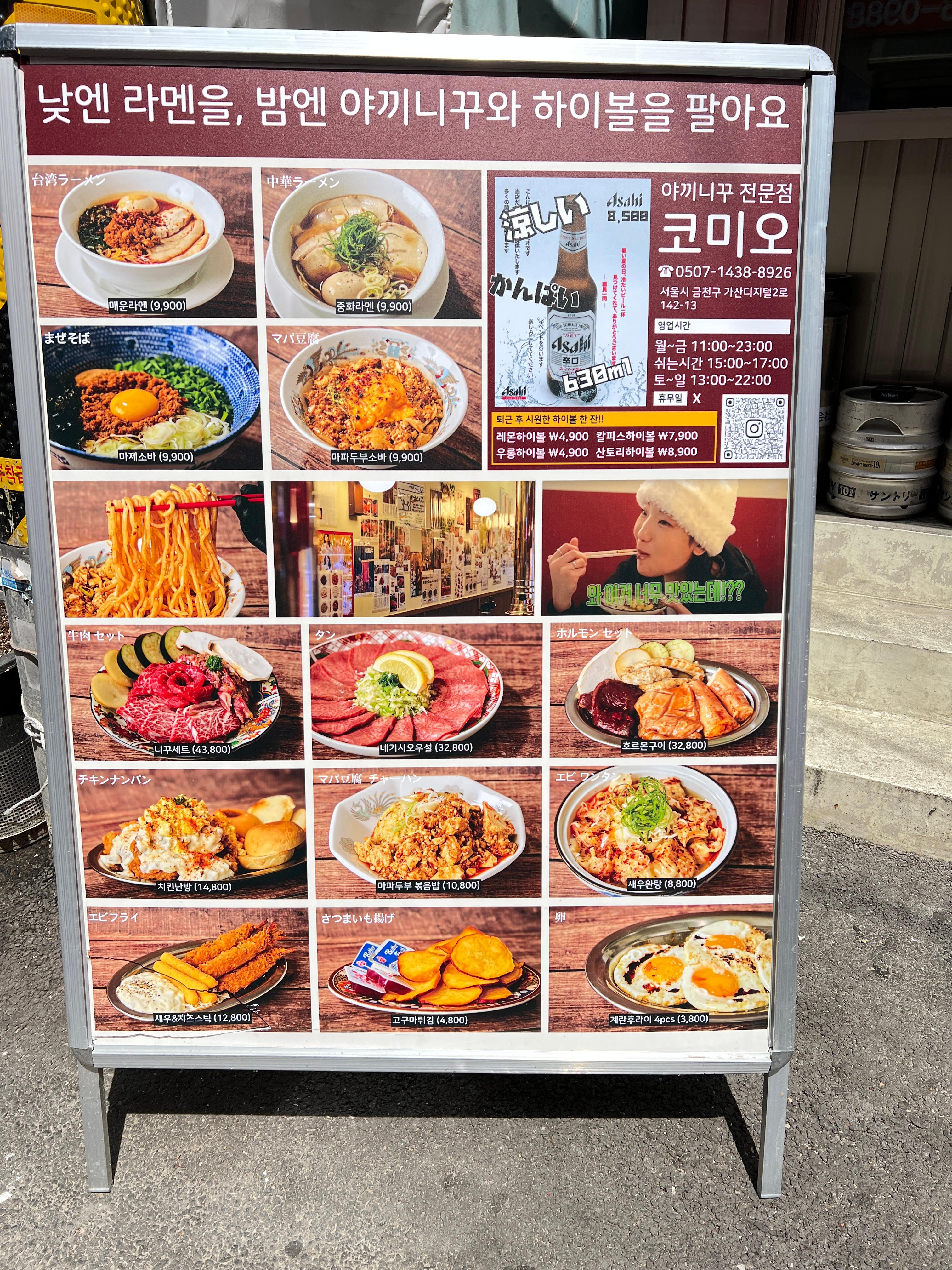 가산동에는 다양한 종류의 맛집이 있는데 점심엔 일본라멘, 저녁엔 야끼니꾸를 파는 집이 있다.