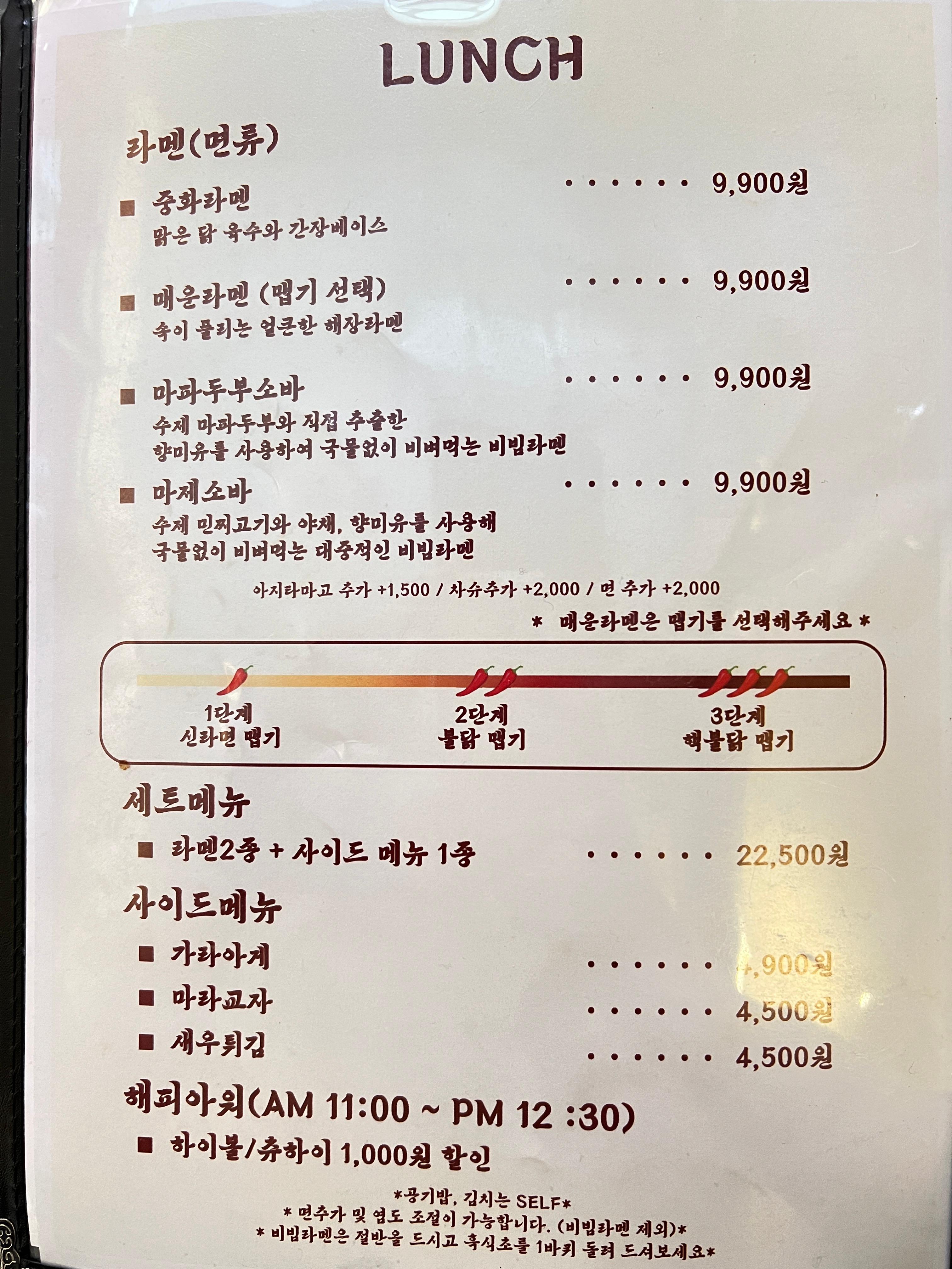 아지타마고(1,500원), 차슈 (2,000원) 추가 가능하고 매운라면은 맵기 3단계 선택 가능하다.